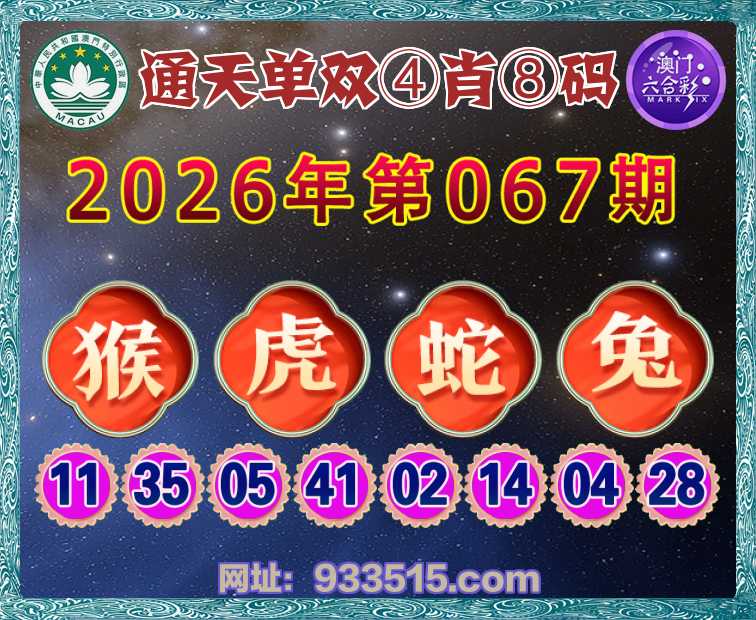 067期:『通天单双』 🏆④肖⑧码🏆【猴蛇兔】开:虎05